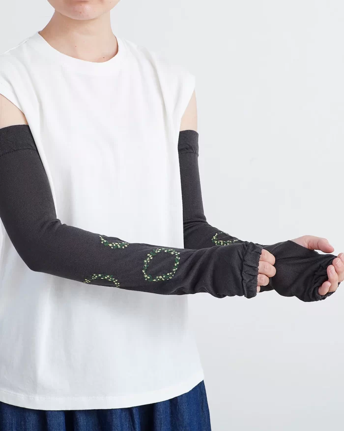 滑らかなレーヨンシルク素材のロング丈UVカットアームカバー。 親指を通す穴は無縫製でやさしい肌当たりです。 皮膚や環境への安全性に配慮された、天然有機系の抗菌防臭加工を施しています。